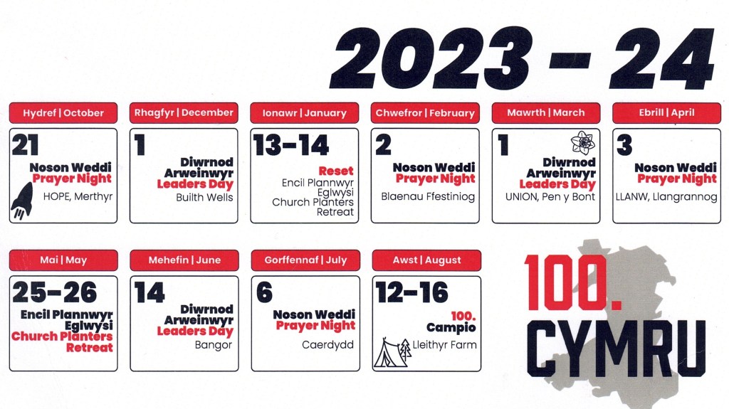 Rhannodd Ben hefyd daflenni sydd wedi eu paratoi gan 100 Cymru. Cynllun newydd anenwadol sydd ar y gweill i blannu eglwysi yng Nghymru.