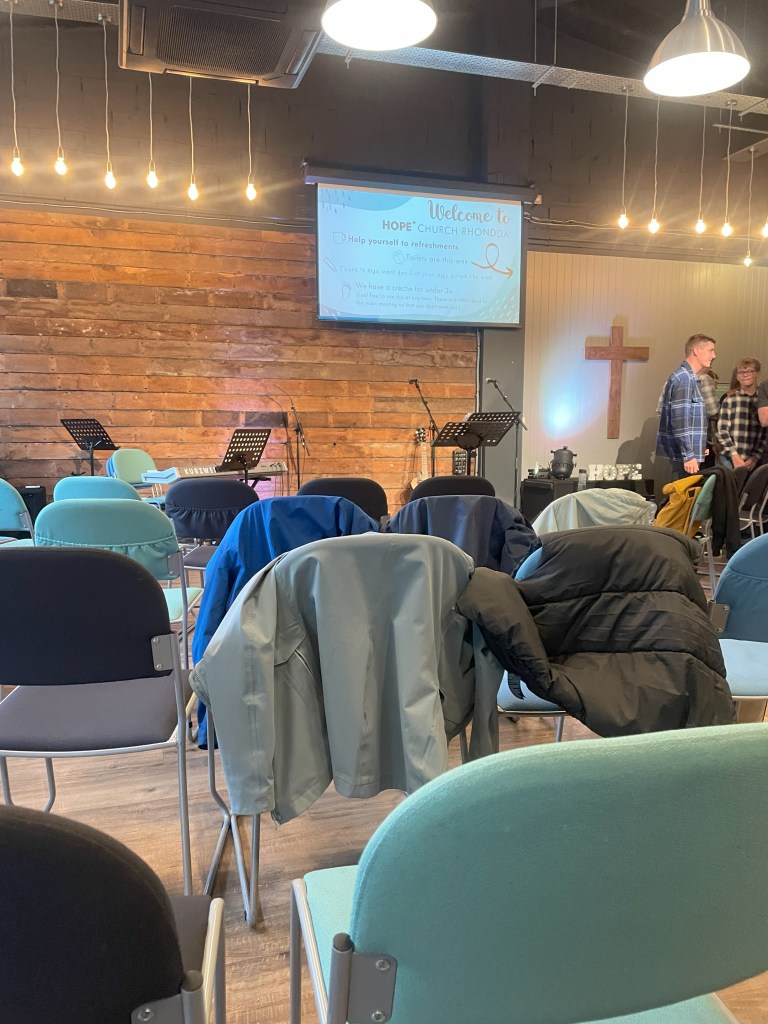Mae’r eglwys hon – a blannwyd ychydig flynyddoedd yn ôl – yn addoli mewn hen siop drydan, sy wedi ei haddasu, ar y brif ffordd trwy’r dref. (Fe soniaf fwy am hyn isod yn y sgwrs a gefais gyd Ben Franks un o’r sylfaenwyr.) Mae’r siop yn union dros ffordd i hen gapel Annibynnol llwm sy yn ôl yr olwg arno wedi cau ers blynyddoedd. Roedd baneri glas yn cyhwfan y tu allan i’r siop yn tynnu sylw at y lleoliad. Fe es i mewn i’r gofod sy’n dal oddeutu 90 – 100 o bobl ac roedd yn gyffyrddus lawn gyda rhyw 60 wedi ymgynnull. Eisteddais i lawr yn un o’r cadeiriau – dwi’n dechrau teimlo fel rhyw fath o addolwr cudd (Mystery worshipper) – ac yn syth bin daeth person ataf i’m croesawu, i ysgwyd llaw ac i gynnig paned oedd yn cael ei weini yn y gornel dde. Mor bwysig yw croesawu a chyfarch dieithriaid i’n hoedfaon ac nid eu hanwybyddu tan y cyhoeddiadau. Roedd awyrgylch braf, cartrefol a chyfoes yno.