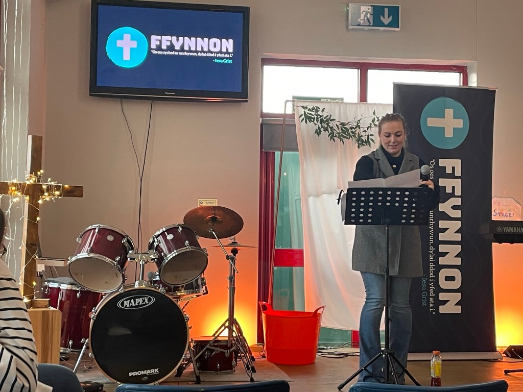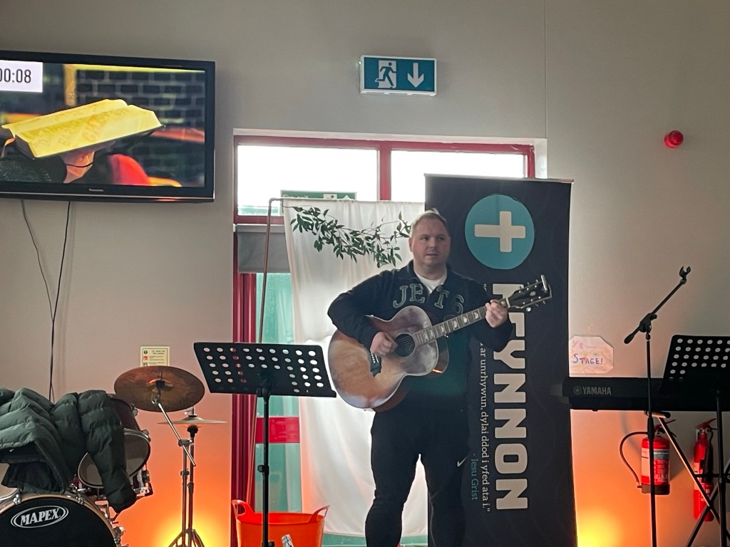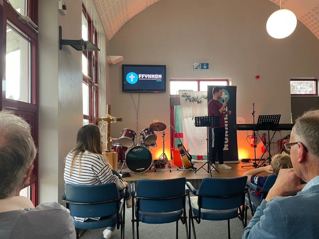 Yn wahanol i’r eglwysi eraill bûm ynddynt yn ystod y tri mis diwethaf, roeddwn yn adnabod rhai o’r bobl oedd yno. Cefais groeso cynnes a sgwrs cyn yr oedfa gyda Sara a Ryland. Croesawyd ni yn gynnes fel cynulleidfa o ryw 35-40, gan Rhys. Roedd y rhan fwyaf oedd yn bresennol yn iau na fi (61) a nifer dda o blant a phobl ifanc. Ar gyfer y di-gymraeg a’r dysgwyr roedd cyfieithu ar y pryd ac roedd geiriau’r caneuon hefyd yn ddwyieithog. (Dwi ddim wedi gweld cyfieithu ar y pryd yn unrhyw un o’r Eglwysi cyfrwng Saesneg er bod nifer o bobl o genhedloedd eraill yn bresennol. Y disgwyliad “ymerodrol” mwn, yw bod PAWB yn deall SAESNEG neu angen dysgu.)